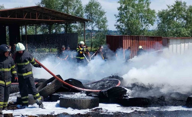Samsun’da geri dönüşüm fabrikası bahçesindeki hurda araç lastikleri yandı.