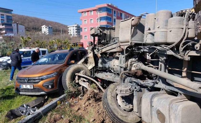 Kaza, Samsun’un Atakum ilçesi Çakırlar Yalı Mahallesi Atatürk Bulvarı Karakavuk Kavşağı’nda meydana geldi. Edinilen bilgiye göre, Bayram Tirink idaresindeki 10 BDE 26 plakalı hafriyat yüklü kamyon, Cemal Yavuz Yılmaz yönetimindeki 55 YC 181 plakalı otomobile yandan çarptı. Çarpışmanın şiddetiyle her iki araç da refüje savruldu. Kamyonun yan yattığı kazada sürücüler yaralandı. Yaralılar, ambulanslarla Samsun Ondokuz Mayıs Üniversitesi (OMÜ) Tıp Fakültesi Hastanesine kaldırıldı.