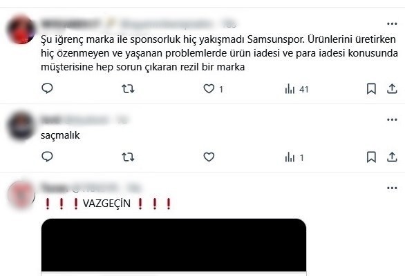 Öte yandan taraftarlar, Reeder CEO’sunun “Samsunspor artık Reeder Samsunspor. Galatasaray bir Türkiye takımı, tekrar Avrupa şampiyonu olacak bu sene. Biz de Beşiktaşlısı, Fenerlisi, Samsunsporlusu, Trabzonsporlusu 4 büyükler, Galatasaray’a ligde açacağımız büyük rekabet yarışı ile tekrar Avrupa şampiyonluğu için hazır tutacağız. Türk futboluna hayırlı olsun” açıklamasına da taraftarlar yoğun tepki gösterdi.
